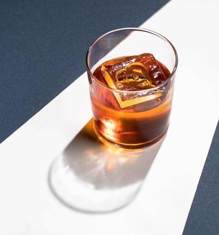 Add all ingredients to a mixing glass/tin and stir with ice. Strain these over block ice into a rocks glass.