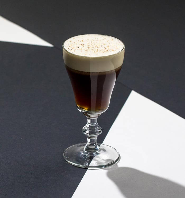 Pour all ingredients apart from the cream into the glass and stir. Finally layer the cream slowly on top, and then a grating of nutmeg.